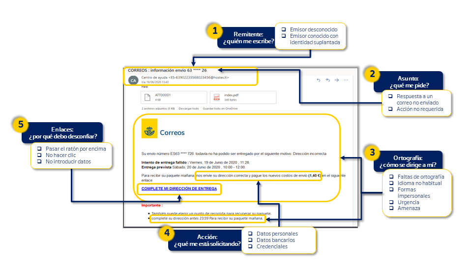 Los correos de phishing suelen contener un archivo adjunto malicioso o un enlace web que conduce a la supuesta página oficial de la entidad suplantada, pero que, en realidad, es una web fraudulenta. En el correo siempre se solicita realizar una acción, que suele consistir en descargar un archivo o en introducir datos personales o bancarios a través del enlace.